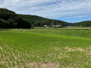 早々と稲刈りを済ませた田んぼでは、この暑さで二番穂が青々と広がり
