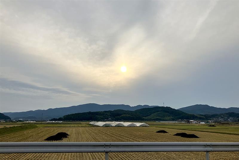 広々とした畑の背景に広がる山並みに太陽が沈もうとする景色をパチリ